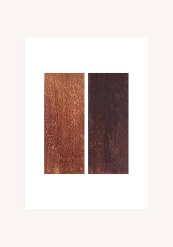 This abstract artwork is composed of two vertical fields in rich brown and earthy tones, placed side by side to create a quiet dialogue of contrast and balance. The layered surface and subtle tonal variations evoke natural materials such as wood, soil, or oxidised metal, lending the piece a tactile, grounded presence. The simplicity of the composition allows texture and colour to take centre stage, inviting slow observation.