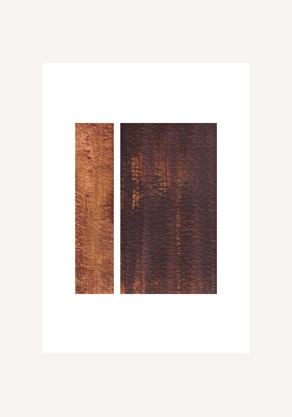 This abstract piece is defined by two vertical elements in warm ochre and deep brown tones, arranged to create a quiet yet expressive contrast. The textured surface and layered colour evoke natural materials such as weathered wood, mineral surfaces, or oxidised metal, giving the artwork a strong material and tactile character. The vertical format enhances the sense of rhythm and structure within the composition.