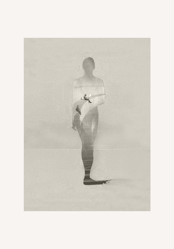 Prometeo draws from the myth of the Titan who gifted fire to humanity, embodying the act of creation as both generosity and transgression. The figure appears fragmented and translucent, as if formed from layers of memory, light, and time, standing in a quiet, undefined space. The absence of facial detail universalises the subject, allowing the image to represent humanity as a whole rather than an individual.