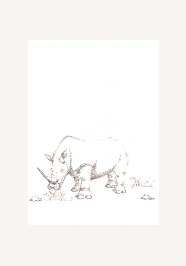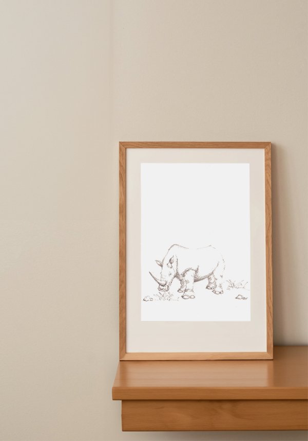 Rhino is a light and restrained line drawing that depicts a rhinoceros in a simple, silent scene. Far from an aggressive portrayal, the artwork presents the animal in a calm, almost intimate gesture, revealing its noble character and deep connection to the earth. The use of soft lines and generous white space enhances a sense of balance and tranquility, allowing the figure to breathe and become the focus of the composition. A piece that speaks of contained strength, nature, and respect for the essential—ideal for spaces seeking serenity and authenticity