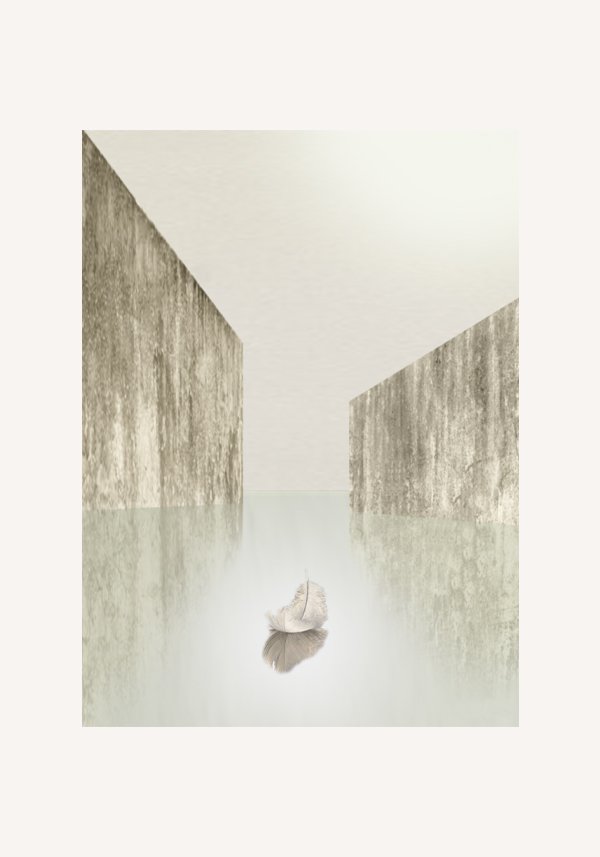 Icaro unfolds within a suspended, almost unreal space where time appears to stand still. Two imposing walls open towards a luminous horizon, while a single feather rests gently on the water’s surface, mirrored with delicate precision. The gesture is minimal, yet deeply symbolic.